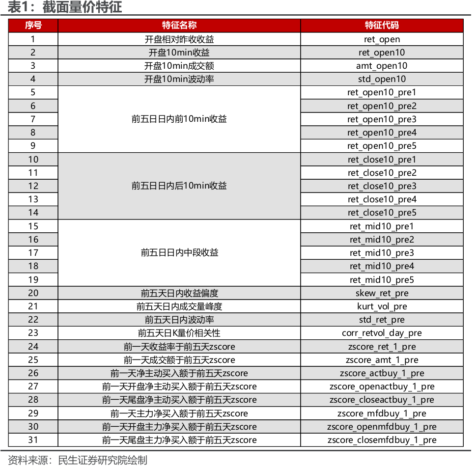 具体而言,截面量价特征包含开盘10min特征,前五日日内走势特征,前五日日线特征,前一天量价和资金面特征。时序量价特征包含OHLCVA的6个维度过去240min(前一日230min,今日开盘10min)的面板数据。