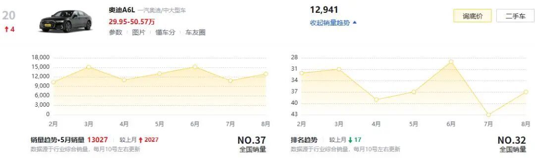 看完新车咱们再聊聊在售的现款A6L,即便换代在即现款A6L月销依旧过万,是56E中销量最好的,而这也与终端的优惠幅度有直接关系。入门车型40TFSI豪华动感目前裸车不到30万,优惠幅度达到了13万元,这个价格买不到5系;45TFSI的入门车型裸车不到32万元,四驱版本可以聊到33万元左右,对比宝马5系要实惠不少。现款A6L从过时的角度来说其实还好,因为隔壁的5系和E级换代后也没带来什么亮眼的东西,座舱体验也没拉开多大差距,说白了都不能与时下热门新能源车比较。所以如果对驾驶辅助、智能化配置无所谓,喜欢自己开且喜欢现款这个感觉的,那眼下A6L的价格大概率就是历史最低了。