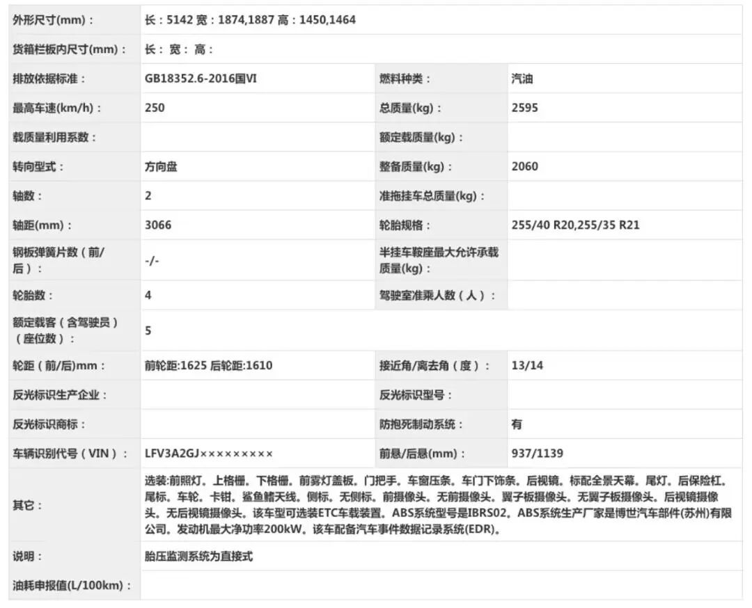 尺寸方面,该车长宽高分别为5142/1874(1887)/1450(1464)mm,轴距为3066mm。做个对比:现款车型长宽高分别为5050/1886/1475mm,轴距为3024mm,长宽分别增加了92mm和1mm,车高减少了11mm,轴距增加了42mm。整体更加修长低趴,尺寸超过5系和E级,同级最大。
