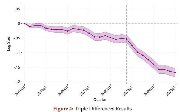 三重差分法的结果再次验证并强化了此前的发现。数据显示,从2023年第一季度起,在采纳AI的公司内部,初级岗相对于资深岗的比重,累计下降了近12%。