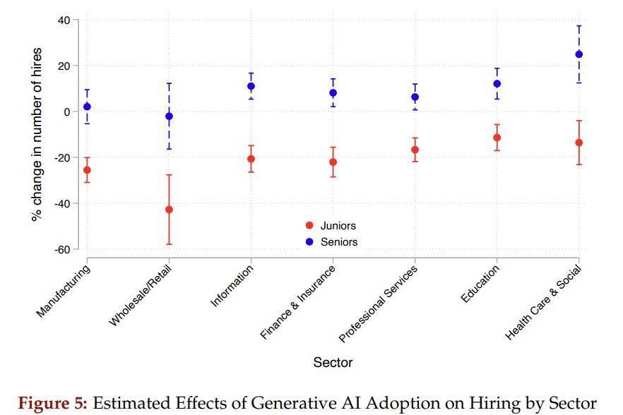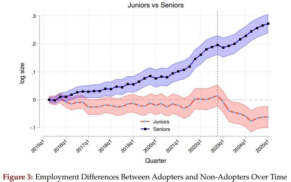 研究结果为“AI导致初级岗位减少”这一因果关系,提供了强有力的间接证据。