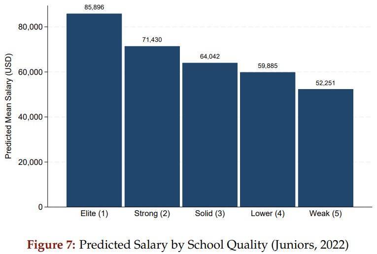 他们发现了一个有趣的U型现象:受冲击最显著的,是来自Tier 2和Tier 3中间梯队院校的毕业生。来自Tier 1顶尖名校和排名靠后院校的毕业生,受到的影响反而较小。Tier 5院校毕业生的就业下降幅度甚至是最小的,且在统计上不显著。