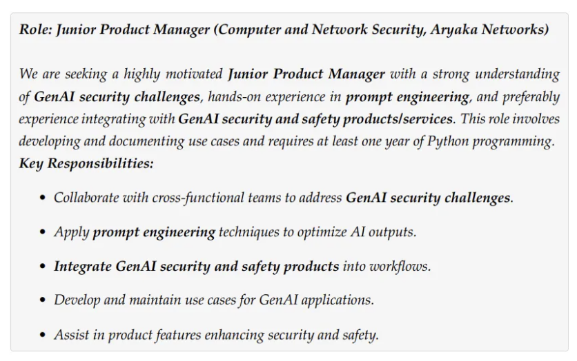 例如,一个初级产品经理岗位要求“对生成式AI安全挑战有深刻理解”和“有提示工程的实践经验”,或一个“生成式AI开发顾问”的职责是“生成式AI模型的可扩展设计和开发利用”。