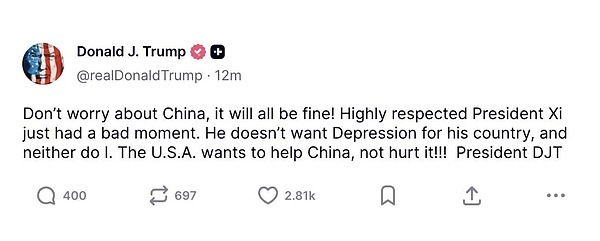 但好消息是,2025年10月的熊市已经正式结束。为什么?特朗普总统周日晚间在社交媒体上保证,“一切都会好起来的”,“美国想帮助中国,而不是伤害它!”