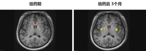 多巴胺能功能成像:神经突触多巴胺能显像是评估人脑黑质纹状体神经元完整性和功能的“金标准”,常用于帕金森病亚临床诊断1-2。接受移植手术3个月后PET-DAT/MRI融合影像明确显示,移植细胞已在患者脑内定植并成功转化为有功能的多巴胺能神经元,双侧纹状体形成显著的de novo新生多巴胺能活性成像(如下图箭头所指), 为功能性治愈提供了最直观的证据。