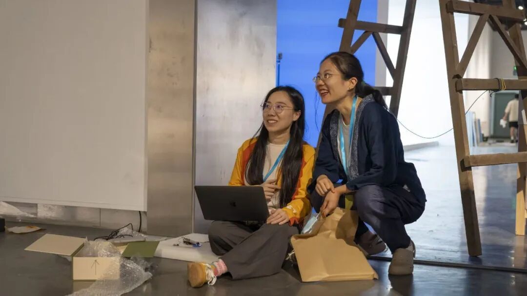 ▲ 许嘉在布展时与艺术家李军毓讨论