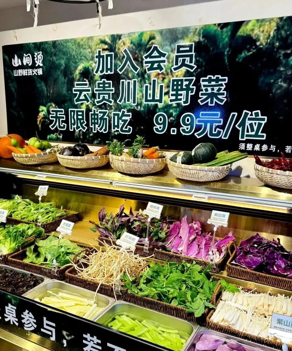 还有山间烫·山野鲜货火锅,走的是极致低价策略,加入会员,只要9.9元/位,就能无限尝试几十种云贵川的山野菜,主打“白菜价吃野菜”。