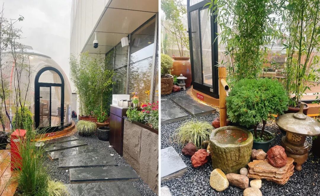 室内区域装修风格主打清新森系,跟之前捞系的标准化装修略有区别。户外区域在商场最高层的露台区域,视野开阔,造景看起来十分用心,满眼的绿植鲜花,雨后的石板路,更增加了氛围感,包间设置类似于先前的泡泡屋,也给聚会提供更多私人空间。
