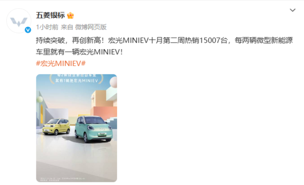 10月15日,五菱宏光官方公布了宏光MINIEV在十月第二周的销量。数据显示,该车在在十月第二周售出15007台。官方称,每卖出两辆微型新能源汽车里就有一辆是宏光MINIEV。