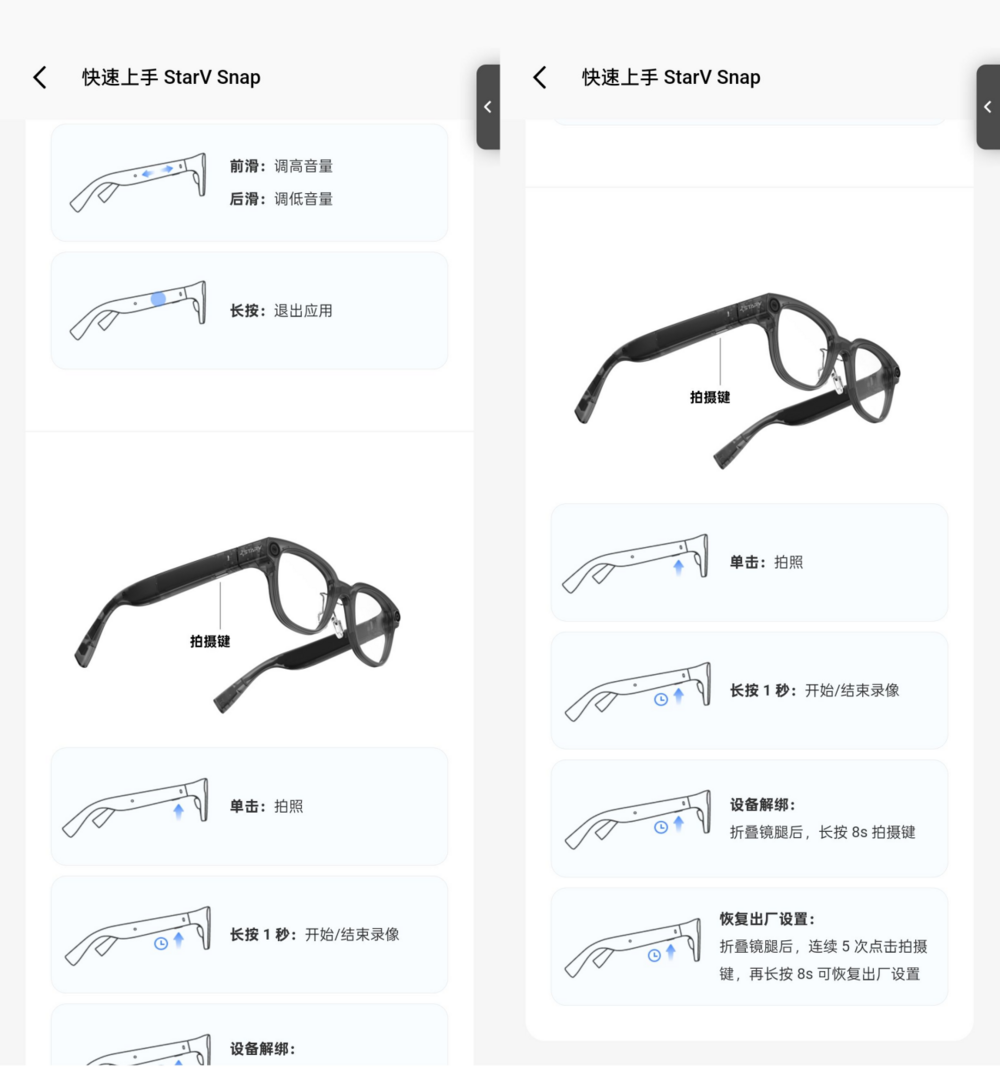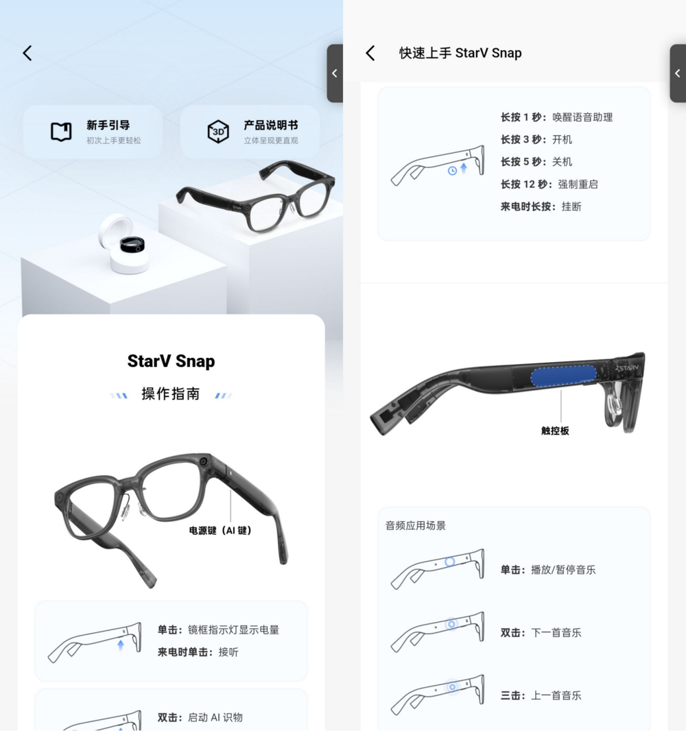 魅族StarV Snap的交互设计,完全贴合日常使用习惯。最常用的控制方式集中在右镜腿的触控感应区,单指单击可实现拍照、录像切换,前后滑动能调节音量,双击暂停录制,操作逻辑与蓝牙耳机高度一致,上手成本极低。