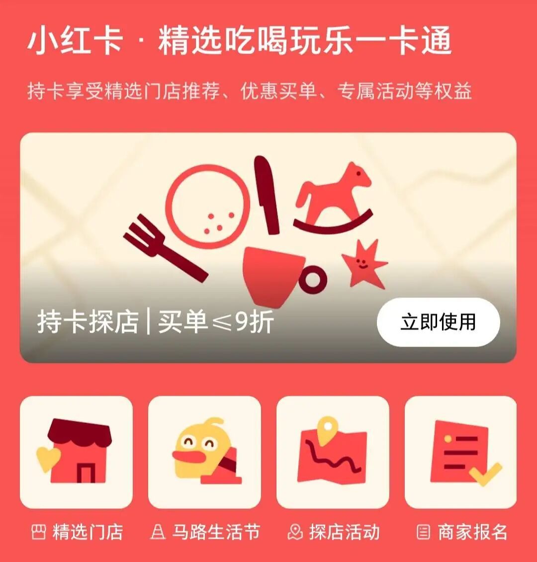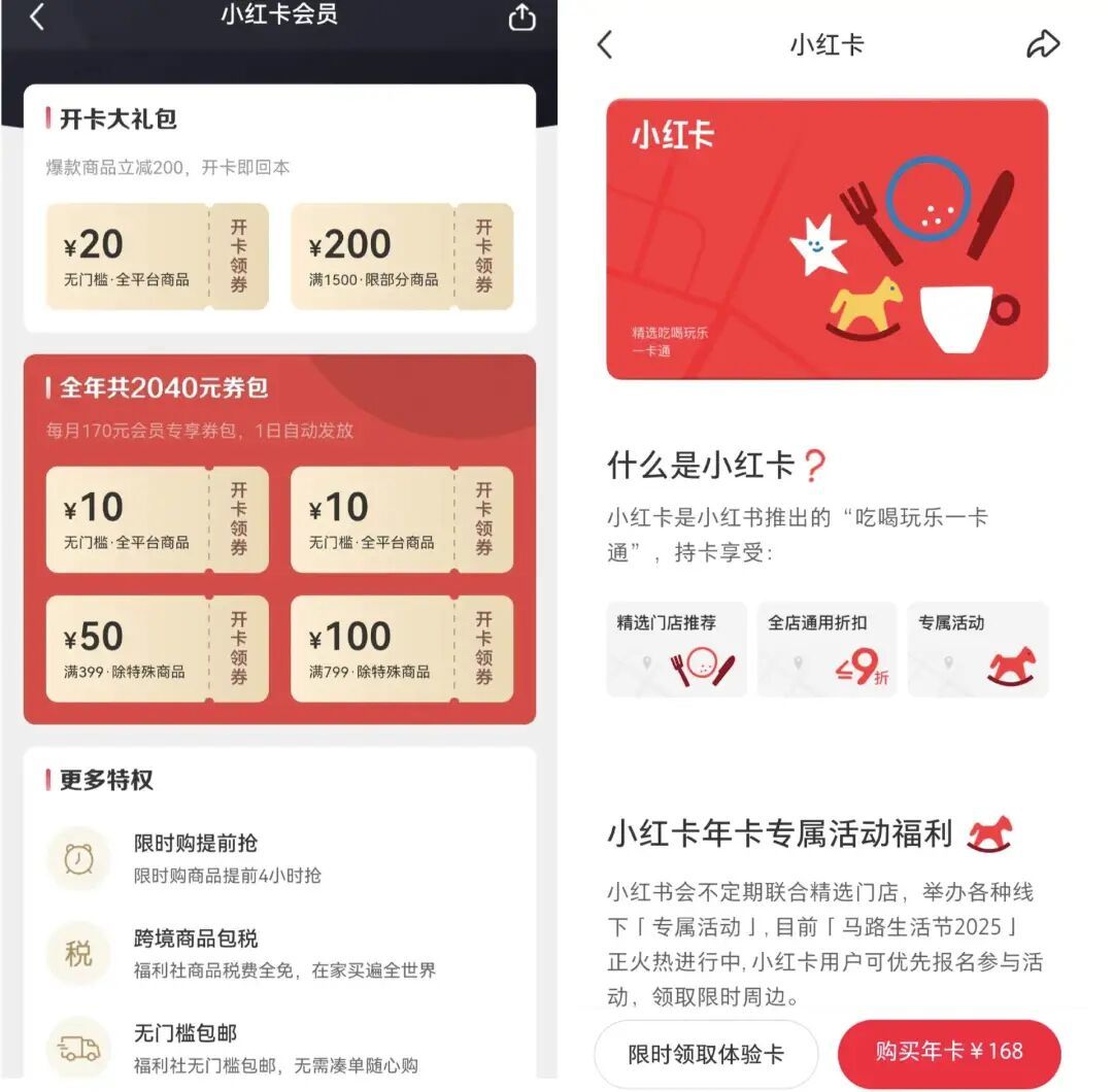 按照小红书官方给出的定义,“小红卡”是其推出的“吃喝玩乐一卡通”,年卡售价为168元,持卡可以在“上千家精选门店”享受买单折扣,并在包括“马路生活节”等在内的线下活动中获得优先报名资格、领取主题周边。