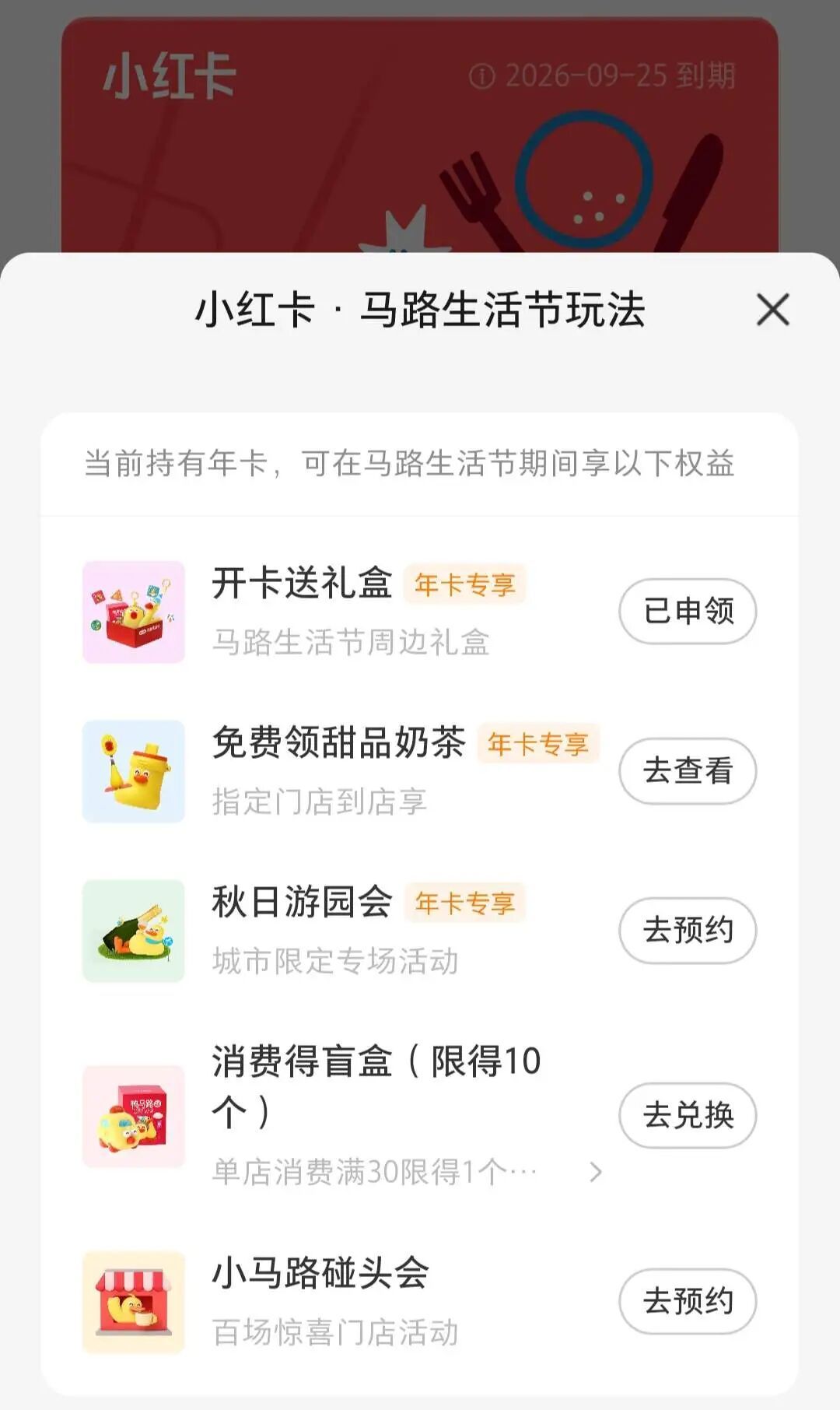 “赚了”的前提是投入足够的时间。除了周边礼盒可以线上填写地址邮寄之外,其他所有与马路生活节绑定的小红卡年卡权益都必须在线下兑现——甜品奶茶兑换券只允许到店使用、由商家滑动核销,城市限定活动和门店趣味体验都需要抵达指定地点沉浸式感受,签到通常是活动流程的第一步。
