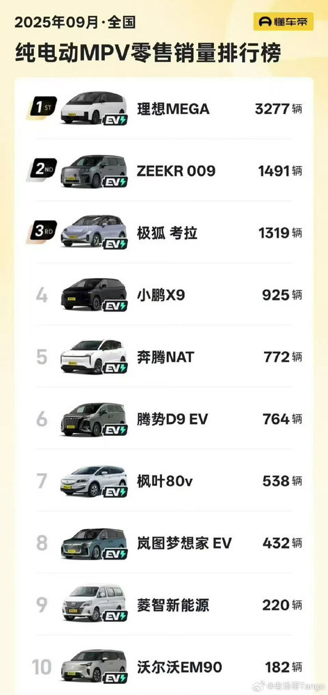【CNMO科技消息】据最新零售数据显示,2025年9月全国纯电动MPV市场呈现显著分化态势。CNMO注意到,曾经遭遇市场波折的理想MEGA成功实现“逆袭”,凭借3277辆的销量强势登顶,其销量不仅远超第二名极氪009与第三名极狐考拉之和(2810辆),更以超第二名两倍以上的绝对优势巩固了市场领导地位。