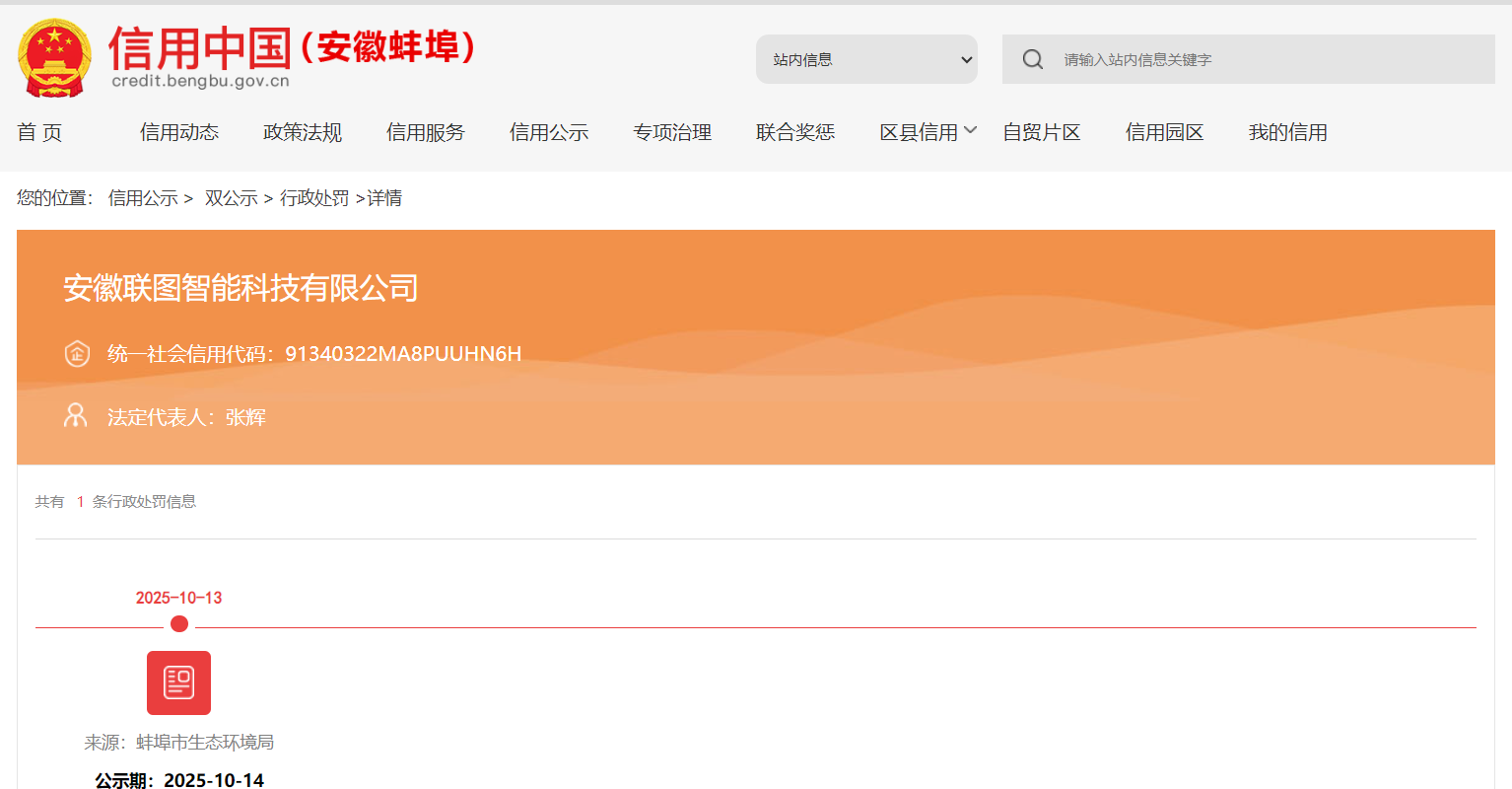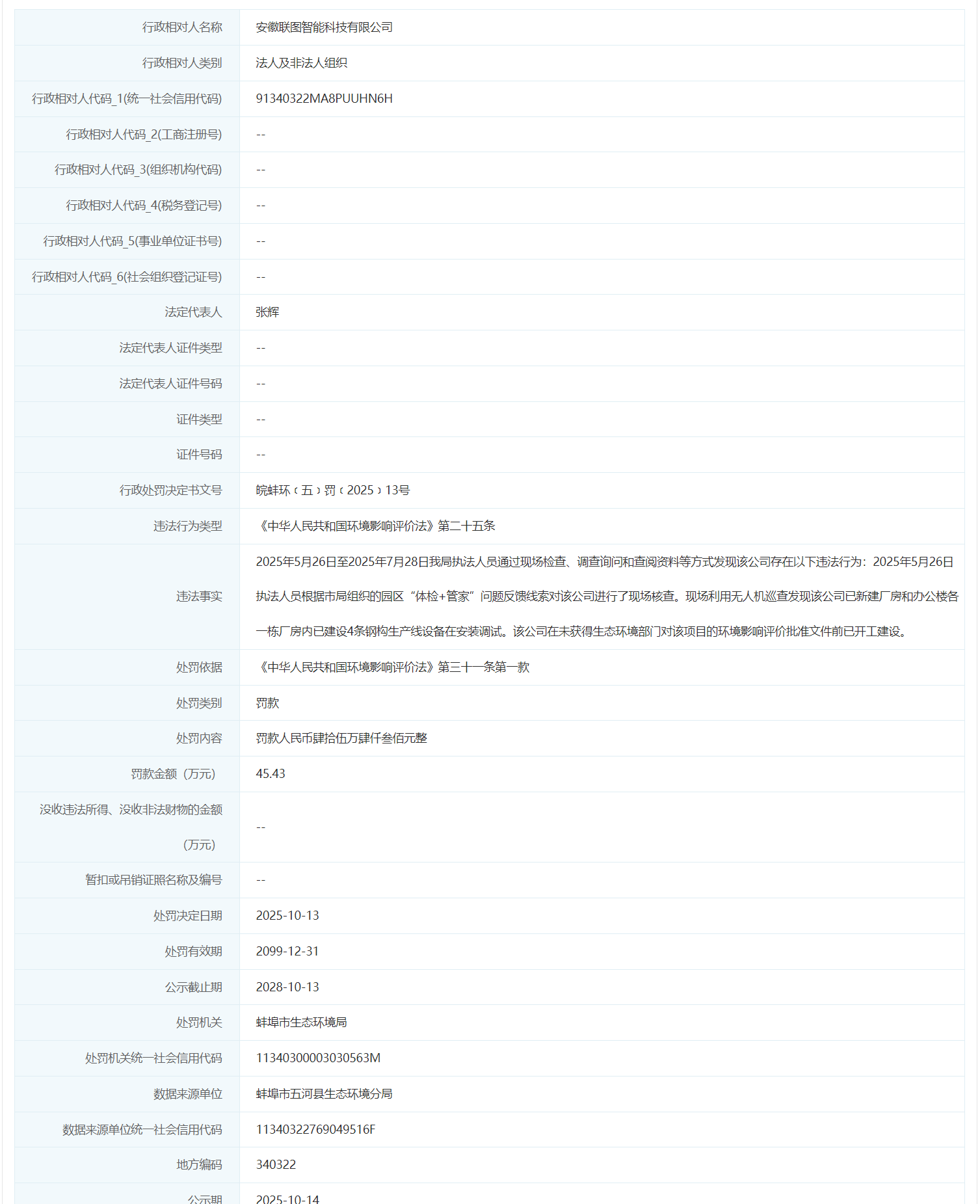 近日,信用蚌埠披露行政处罚信息,因未获环评批复文件擅自开工建设4条钢构生产线,安徽联图智能科技有限公司被处罚款45.43万元,行政处罚决定书文号为皖蚌环﹝五﹞罚﹝2025﹞13号。
