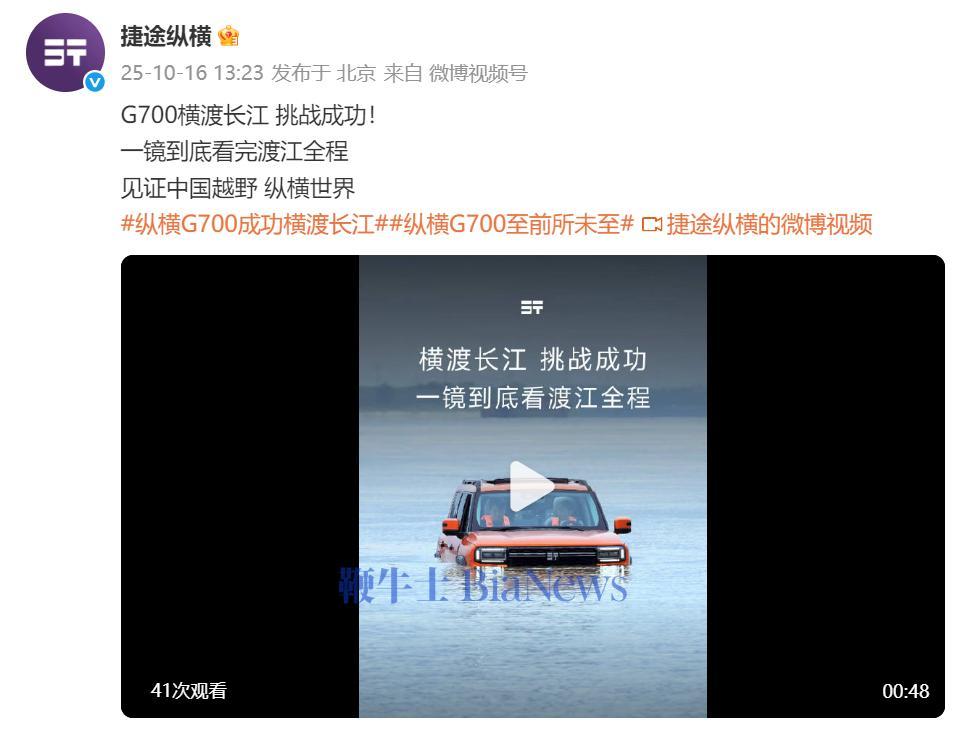 奇瑞旗下捷途纵横官方宣布,G700于今日成为首款成功横渡长江的越野车。