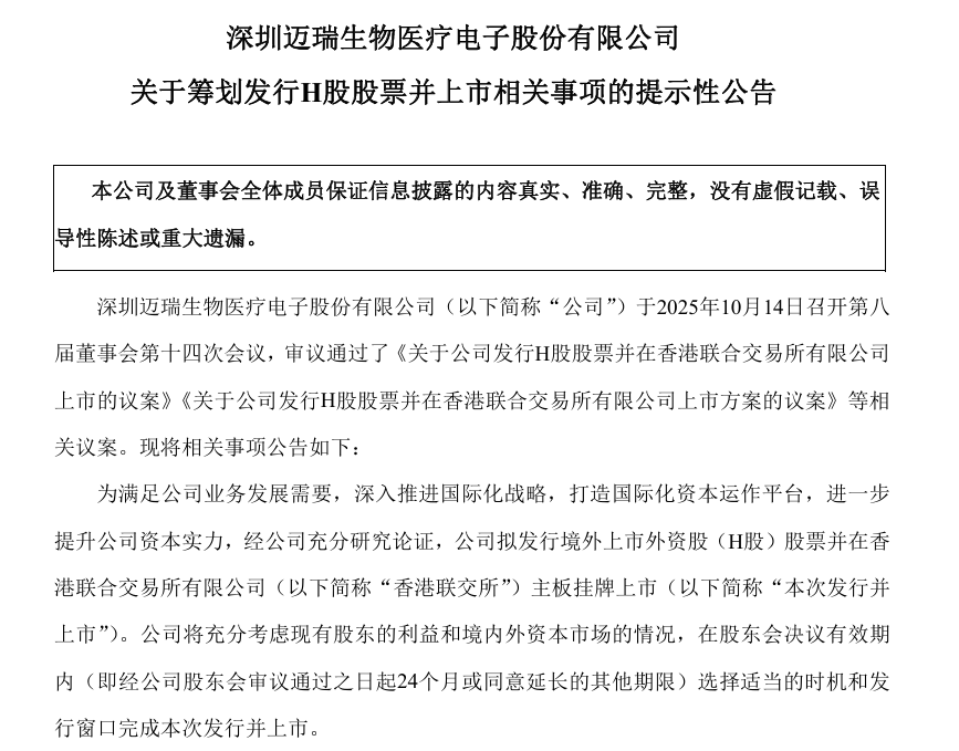 10月14日晚间,深圳迈瑞生物医疗电子股份有限公司发布公告,公司第八届董事会第十四次会议审议通过了发行H股并在香港联交所主板上市的相关议案。这意味着,中国医疗器械龙头企业迈瑞医疗正式启动赴港上市进程。