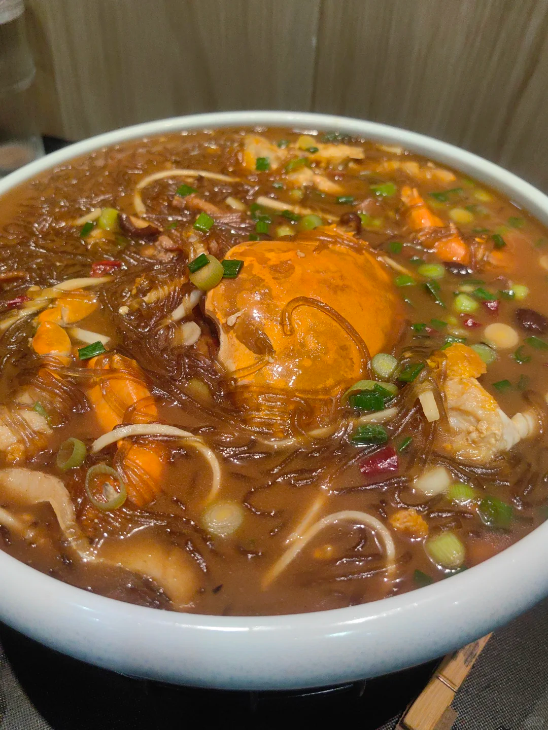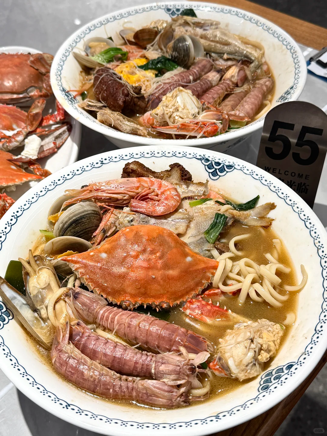 不过最让滚妹上头的是红膏呛蟹,蟹肉像果冻一样滑进嘴里,咸鲜开胃,配饭绝了;再来一碗海鲜面,整只梭子蟹、大虾、蛏子往里堆,汤头鲜得眉毛都要掉下来!