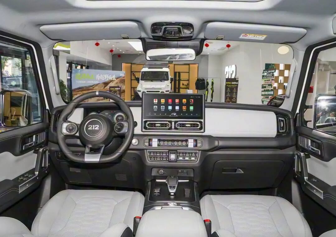 车内方面,相比汽油版没有做出什么调整,纯纯的硬派SUV既视感,与时下新能源车形成了反差。车内尽量多的使用了物理按键,按键功能分区明确,包含空调控制区和越野功能控制区,在颠簸路面行驶时更容易操作。车机大屏的流畅性也还不错,时下流行的主流功能也都具备,白色内饰感觉放在这台车上,有种说不出来的感觉,不太搭?