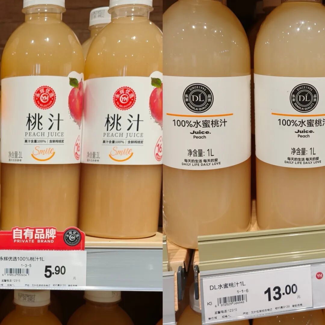 我们在店内发现,永辉优选的一款100%桃汁,1L一瓶仅售价5.9元,而一旁的胖东来自营商品货架上,1L一瓶的100%水蜜桃汁售价13元。还有贴标YH Bakery的520g原味+伯爵红茶瑞士卷,一盒8片售价19.9元,每片单价约2.5元;相比山姆的MM瑞士卷16片1.2kg售价59.8元,每片约3.7元。