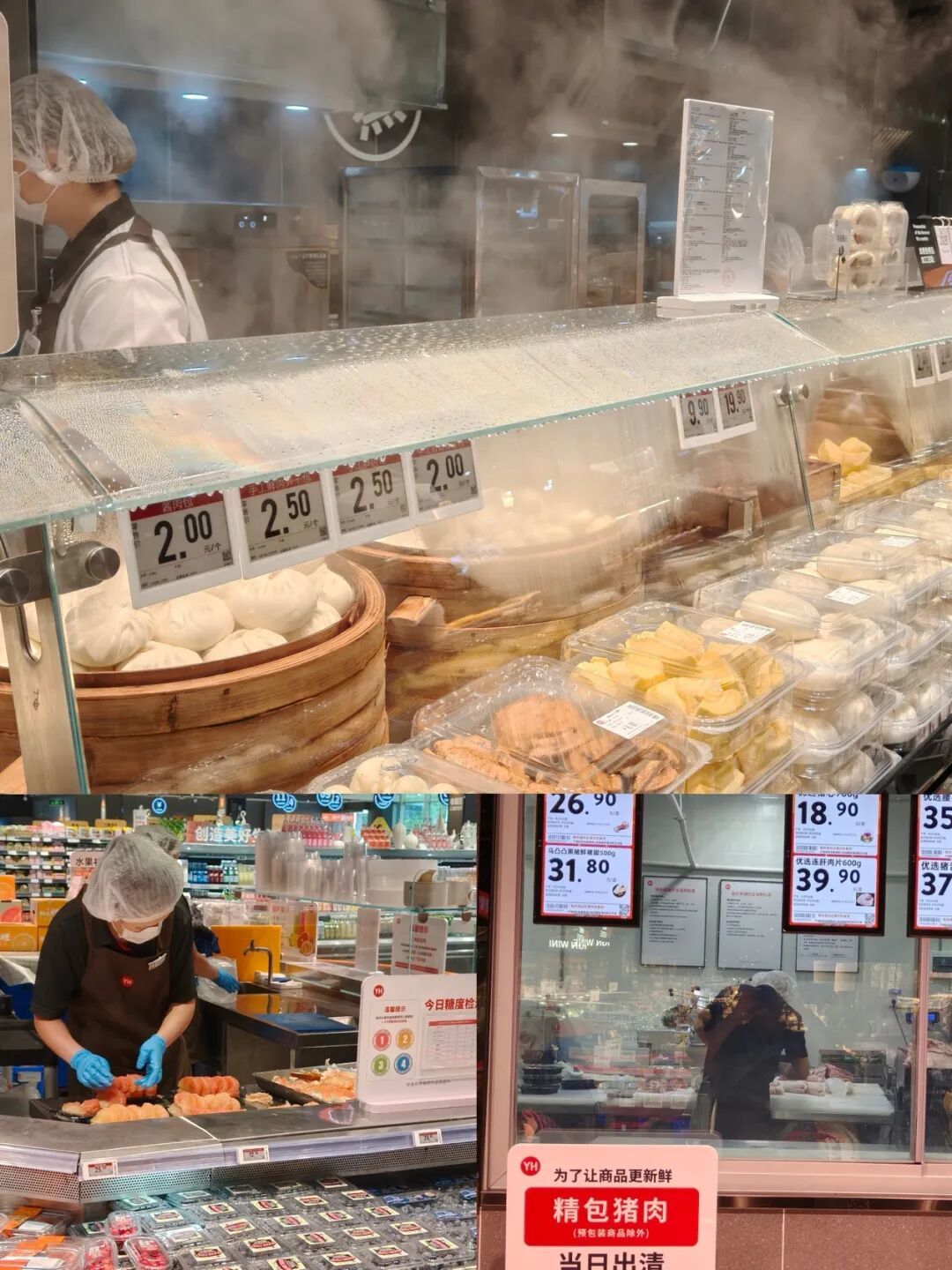 在店内,消费者既能看到面点区冒着热气的馒头包子,也能透过玻璃看到鲜肉区的员工在低温操作间分切猪肉,水果区更有员工在陈列岛后现切、包装水果。