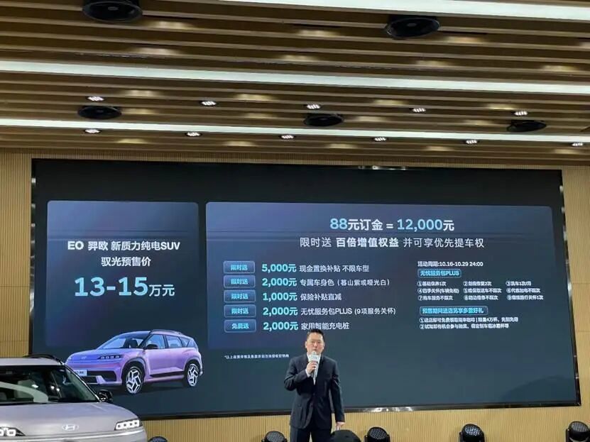 10月16日,北京现代EO羿欧在北京顺义工厂正式量产下线,并同步开启预售,预售价区间13-15万元。同时,用户支付88元订金,限时送12000元百倍增值权益并可享优先提车权。据悉,新车将于10月29日正式上市。