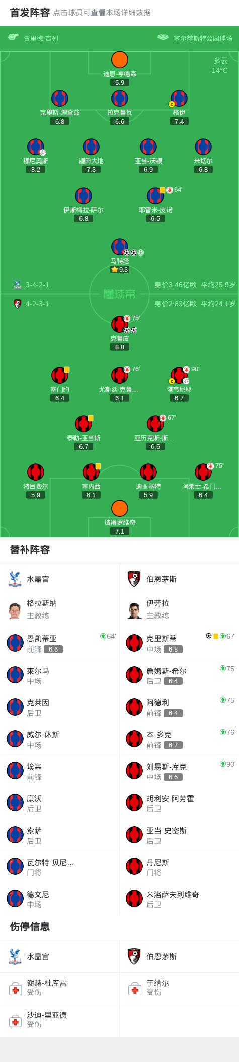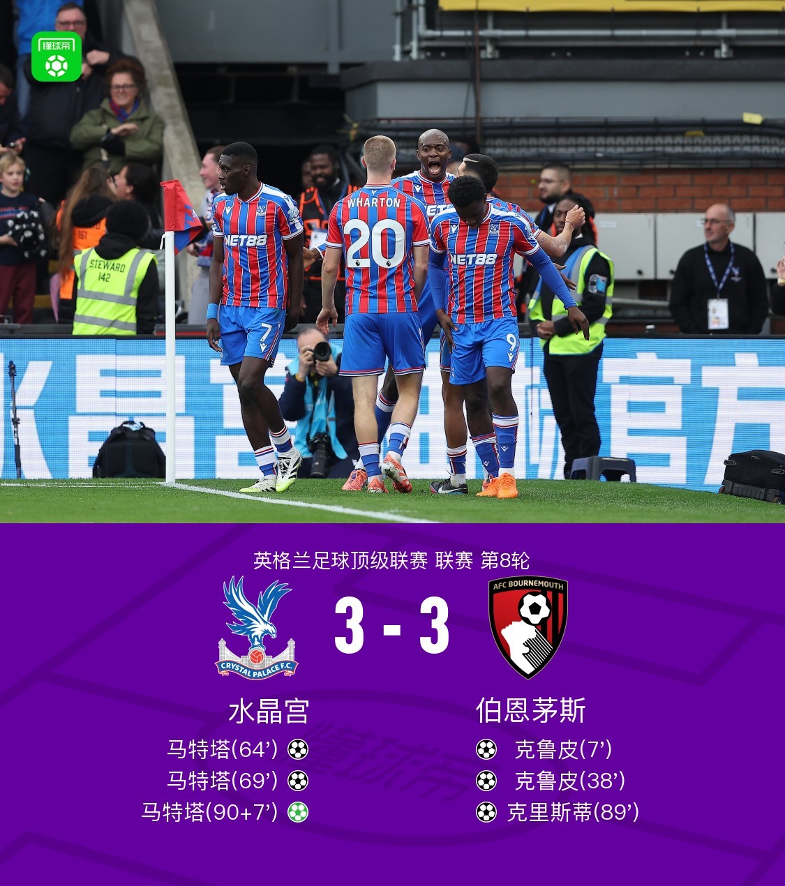 北京时间10月18日英格兰足球顶级联赛 联赛 第8轮,水晶宫主场对阵伯恩茅斯。水晶宫马特塔帽子戏法。伯恩茅斯 克鲁皮梅开二度,克里斯蒂破门。最终比分水晶宫 3-3 伯恩茅斯。