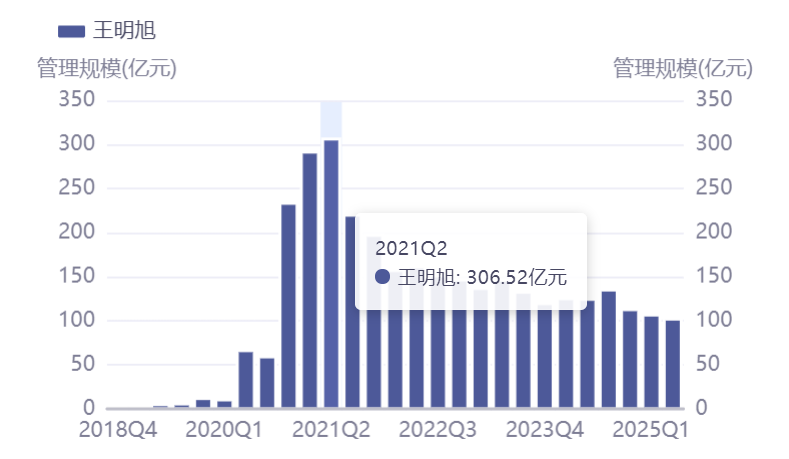 同花顺iFinD显示,王明旭管理规模最高时是在2021年二季度末,达到约307亿元,而截至今年二季度末,仅剩约102亿元,缩水近67%。