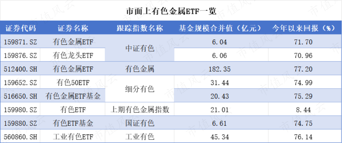 风云君为此整理了市面上规模大于1亿的有色金属ETF,今年以来回报均超过70%,以供投资者参考。