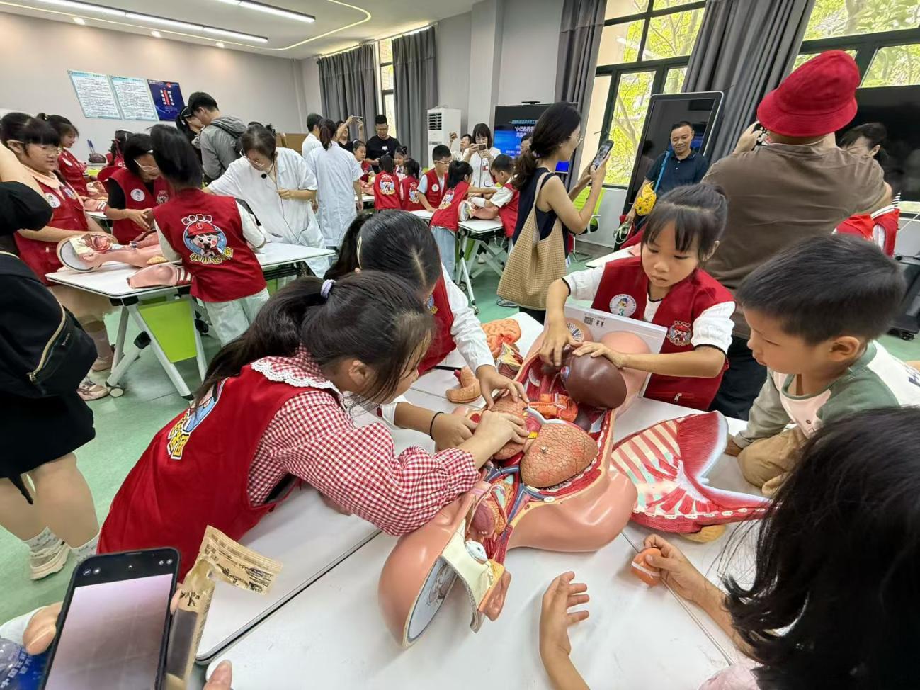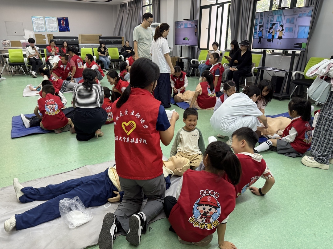 解剖实验中心的人体趣味拼装区,党员教师结合常见临床疾病,激情澎湃地讲解人体重要结构,并组织孩子们以4-6人小组为单位开展拼装挑战赛。大家团结协作,在欢声笑语中直观理解了人体结构的整体性。急救体验区里,小朋友和家长认真聆听心肺复苏操作要领,在学生志愿者的指导下依次动手体验按压动作,切实掌握了基础急救技能。