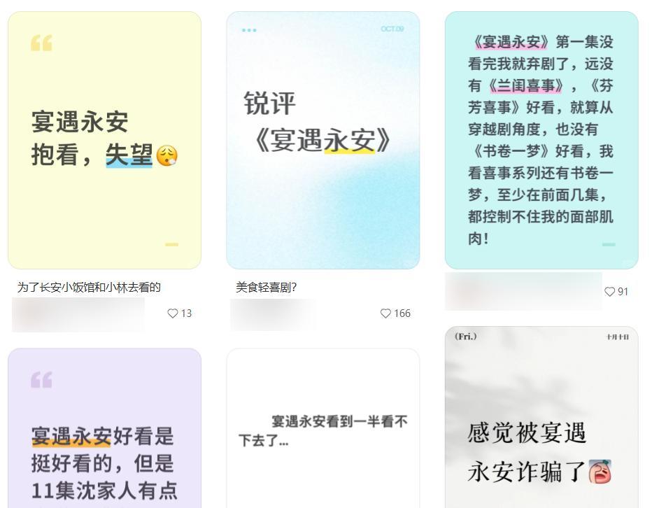 有观众表示,本来抱着看“美食剧”的期待观看《宴遇永安》,却发现它仅作为背景点缀。即使后期女主一家开启饭馆经营副本,也无法弥补观众落空的期待,心理预期与实际观感的落差让作品在首播阶段不被看好。
