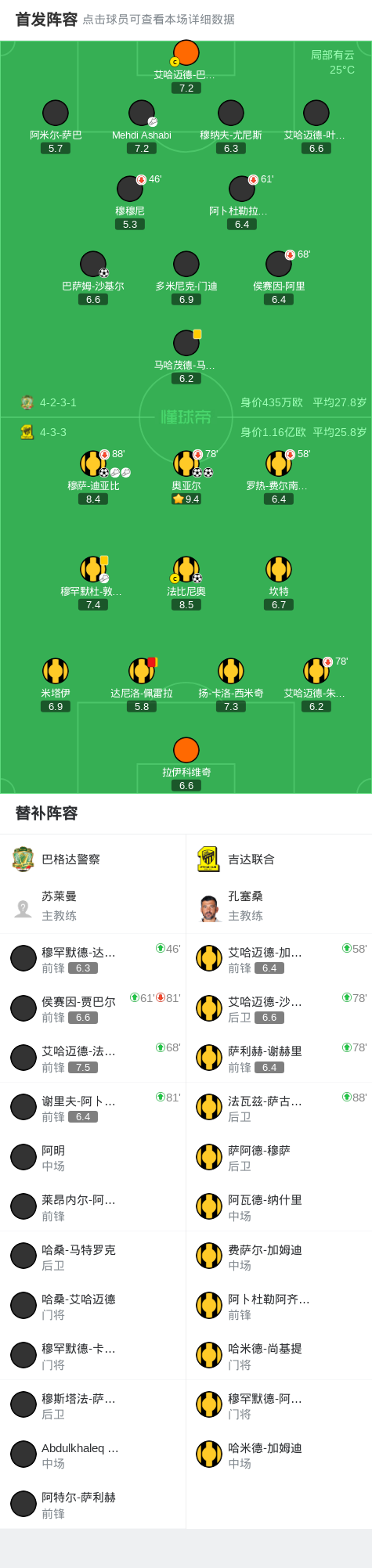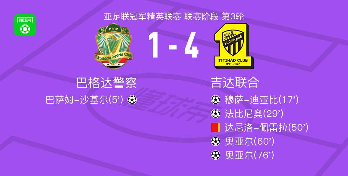 北京时间10月21日亚足联冠军精英联赛 联赛阶段 第3轮,巴格达警察对阵吉达联合。巴格达警察巴萨姆-沙基尔破门。吉达联合穆萨-迪亚比破门,法比尼奥破门,奥亚尔梅开二度。最终比分巴格达警察 1-4 吉达联合。
