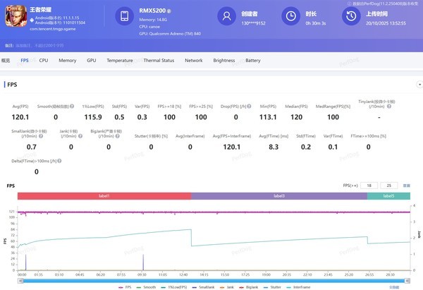 在《王者荣耀》帧率测试中,真我GT8 Pro可以开启120帧+极致画质,30分钟游戏时长平均帧率可以保持在120.1帧,表现非常稳定,在保证画质的同时,120帧模式让整体的游戏体验更为顺滑。