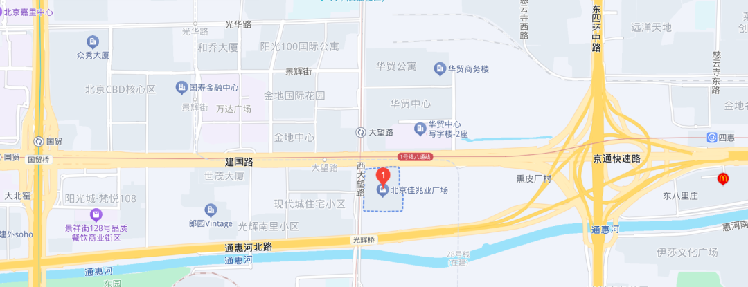 佳兆业广场位于建国路86号,地处长安街与西大望路交汇处东南角,紧邻地铁1号线/14号线大望路站,占地面积8000平方米,总建筑面积约24.7万平方米,其中南塔40层,高度约150米;北塔43层,高度约180米。目前对外租金报价约7-10元/平方米/天。