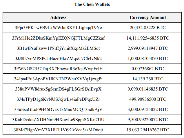 起诉书指出,大约到2020年,陈志已经积累了大量由诈骗收益转成的加密货币,存储在25个加密货币地址中。起诉书也具体列出了这25个钱包地址及其对应的比特币数量。现在,这些加密货币都存储在由美国政府控制的地址上。