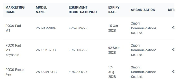 认证信息显示,TDRA登记的POCO Pad M1型号为2509ARPBDG,确认其仅支持Wi-Fi网络连接,未配备蜂窝网络功能。同时,其配套的POCO Pad M1键盘与Focus Pen触控笔也已通过TDRA认证,表明该平板将支持外接输入设备与手写笔操作。