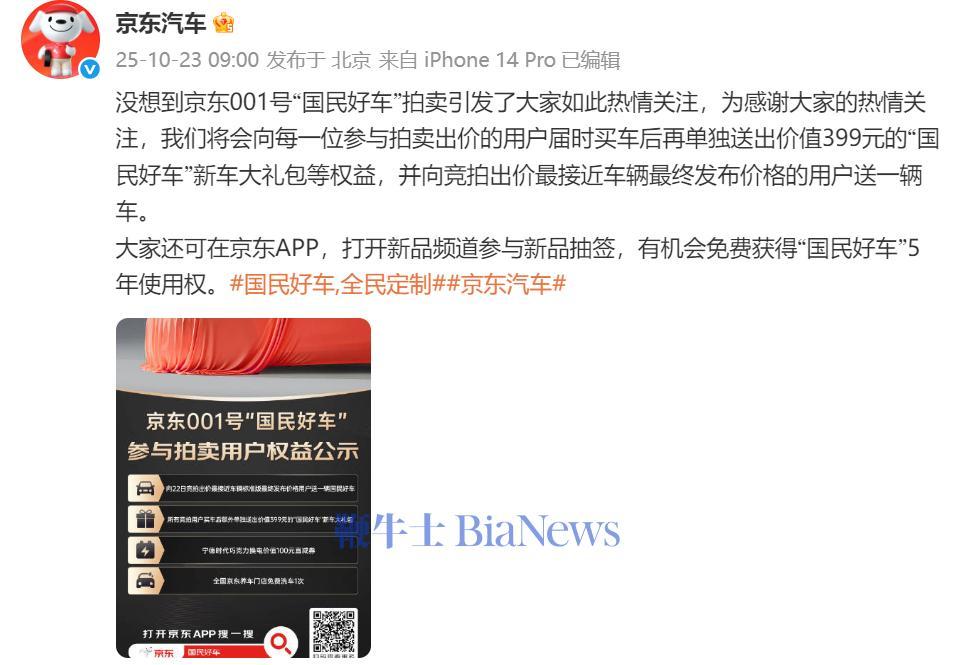 10月23日,京东汽车官方发文称:没想到京东001号“国民好车”拍卖引发了大家如此热情关注,为感谢大家的热情关注,我们将会向每一位参与拍卖出价的用户届时买车后再单独送出价值399元的“国民好车”新车大礼包等权益;