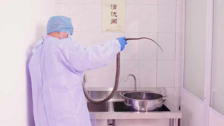 制剂师在车间里处理活蛇。(医院供图)