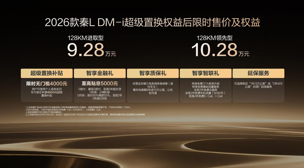 扉旅汽车讯:10月23日,2026款比亚迪秦L DM-i正式上市。新车推出了2款配置官方售价9.68-10.68万元,2025年11月30日24:00前完成购车开票可享限时无门槛超级置换补贴4000元,超级置换权益价限时9.28-10.28万元。