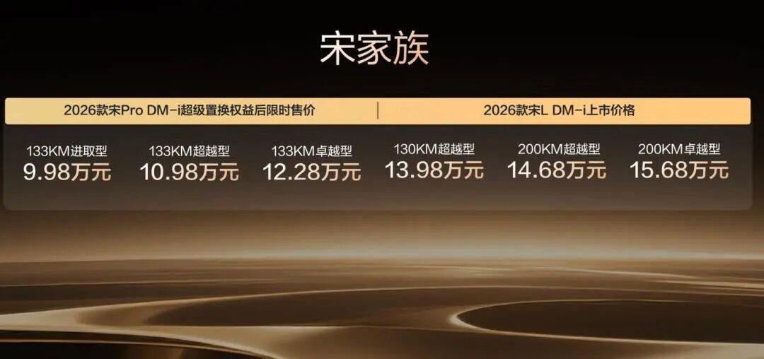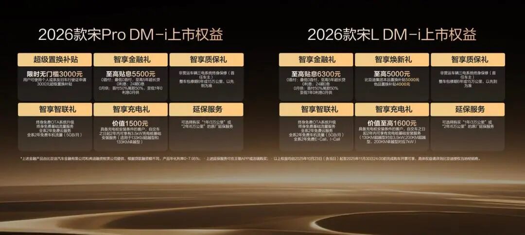 扉旅汽车讯:10月23日,比亚迪宋家族迎来焕新,2026款宋L/宋Pro DM-i上市。其中宋Pro DM-i限时价格为9.98-12.28万元;宋L DM-i售价为13.98-15.68万元。购车权益如下:
