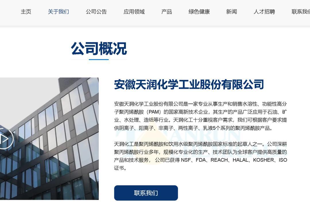 该公司官网显示,安徽天润化学工业股份有限公司是一家专业从事生产和销售水溶性、功能性高分子聚丙烯酰胺(PAM)的国家高新技术企业,其生产的产品广泛应用于石油、矿业、水处理、造纸等行业。该公司是聚丙烯酰胺和饮用水级聚丙烯酰胺国家标准的起草人之一。