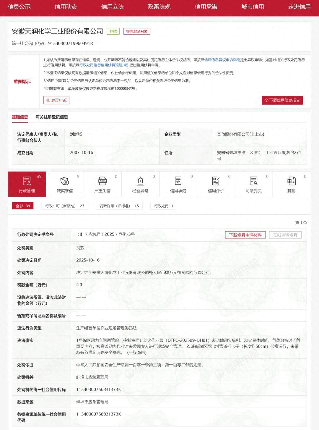 信用中国获悉,安徽天润化学工业股份有限公司因生产经营单位作业现场管理类违法,被蚌埠市应急管理局罚款4万元。