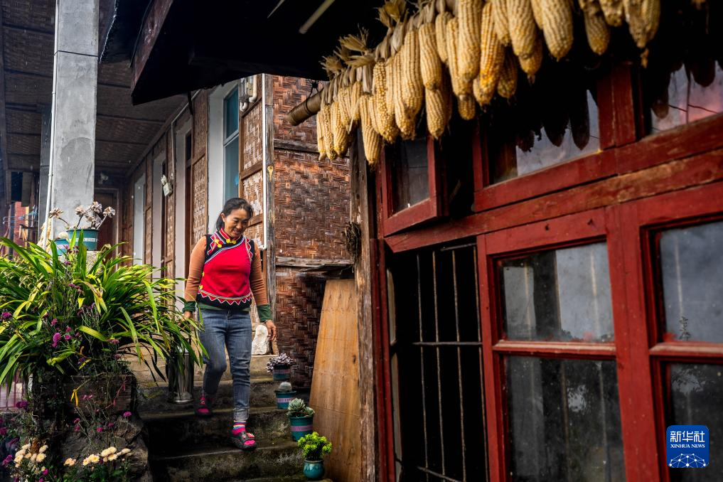 老姆登村村民阿三妞拎着热水瓶前往厨房(10月20日摄)。