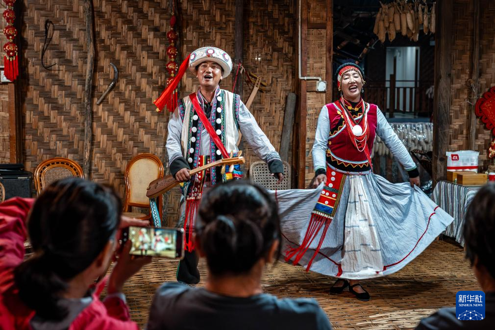 老姆登村村民阿南垮(后左)、杨新妞(后右)在“小慧传习馆”给游客表演节目《火塘恋歌》(10月20日摄)。