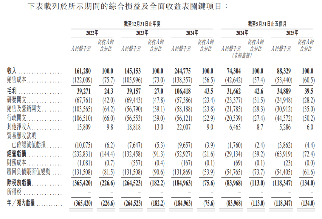 招股书显示,2022年至2024年以及2025年前5个月,云迹科技的收入分别约为1.61亿元、1.45亿元、2.45亿元,以及0.88亿元。报告期内,毛利分别约为0.39亿元、0.39亿元、1.06亿元,以及0.34亿元;毛利率分别为24.3%、27.0%、43.5%,以及39.5%。