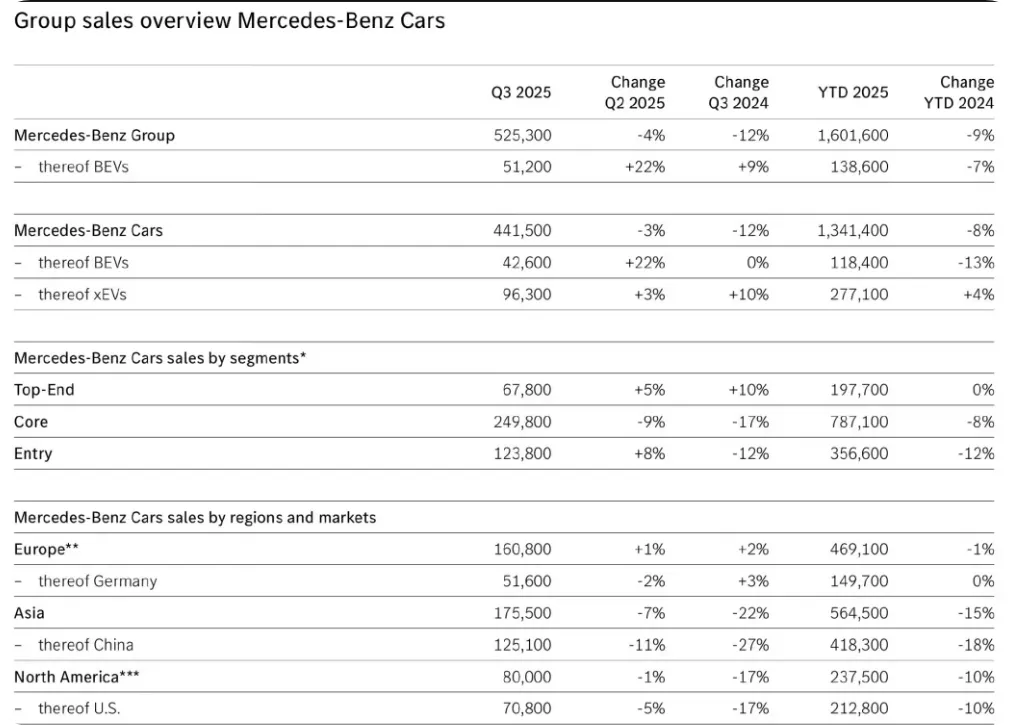 当然,节约成本的背后是奔驰业绩的下滑。近几年,随着电动化的快速发展,奔驰在市场的份额也遭到了严重的缩减,营收与利润都出现了下滑。相关数据显示:去年奔驰营业收入为1455.94亿欧元,与上年同期相比下降4.5%。毛利方面,去年毛利为285.76亿欧元,同比下跌19.5%。税后净利润方面,去年净利润为104.09亿欧元,同比下降28.4%。进入2025年,奔驰的业绩还在继续下滑。据官方公布的最新第三季度销量来看,今年三季度,奔驰全球销量52.53万辆,同比下降12%。其中,美国市场与中国市场都出现了同比下滑。今年三季度奔驰在美销量为80000辆,与去年同期相比下降17%。国内市场三季度销量为125100辆,与去年同期相比下降27%。