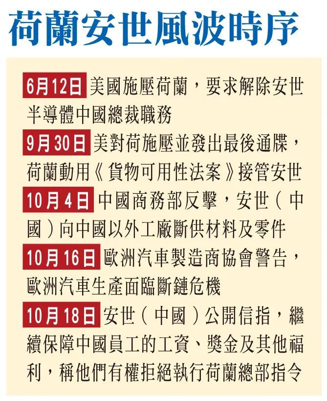 “美国施压下,荷兰首次动用冷战时期法例,抢夺中资的安世半导体,中方以出口限制反击,欧企左右逢源的日子一去不返。”