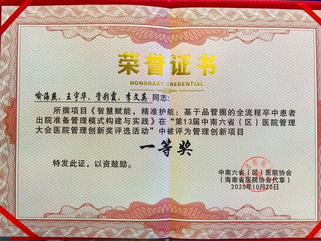 在近日举办的第十三届中南六省(区)医院管理大会上,耒阳市人民医院护理团队申报的项目——《智慧赋能,精准护航:基于品管圈的全流程卒中患者出院准备管理模式构建与实践》,荣获“医院管理创新奖”一等奖,成为湖南省医院管理创新领域的优秀代表。