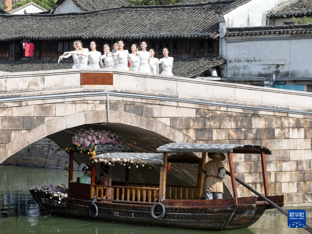 10月26日,浙江音乐学院舞蹈学院演员在新市古镇表演舞蹈《烟波唱晚》。