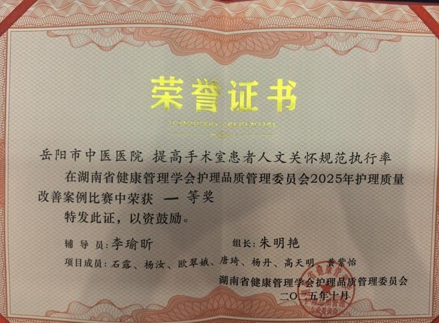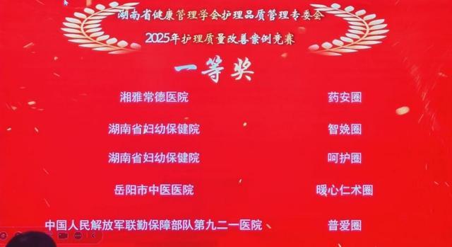 近日,从湖南省健康管理学会护理品质管理专业委员会2025年护理质量改善案例竞赛现场传来喜讯,岳阳市中医医院选送的品管圈项目《提高手术室患者人文关怀规范执行率》,从全省67支参赛队伍中脱颖而出,荣获大赛一等奖。