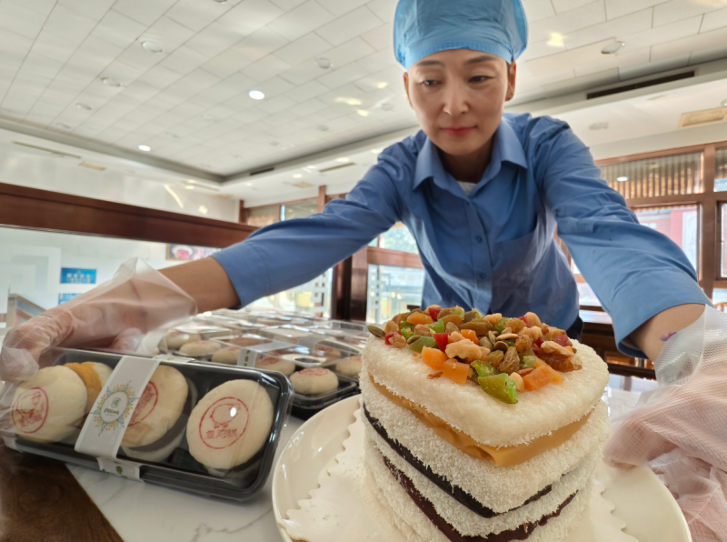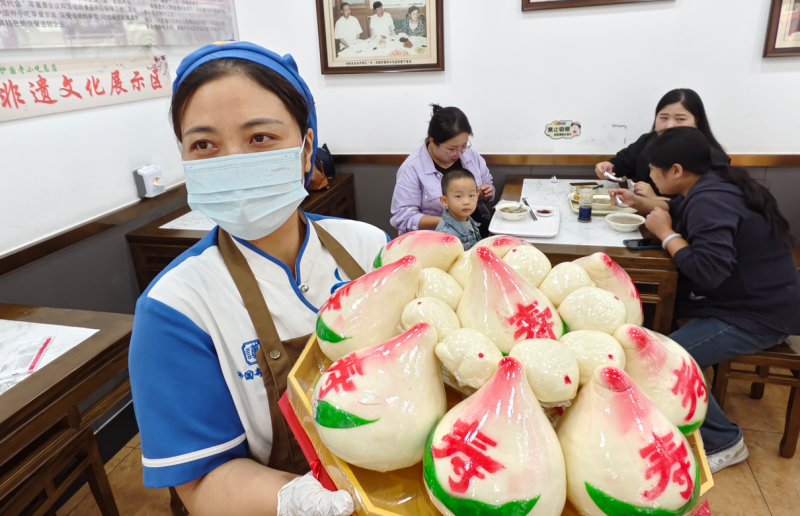 “自9月初起,寿桃订单就没断过,今年还新推了重阳饼。”店经理张猛边整理礼盒边说,新款重阳饼,一盒三枚售价12元,朴素外表下藏着豆沙、枣泥、奶黄三种馅料,“都是中国面点大师监制,当天做当天卖。”据介绍,重阳节最热门的产品当属招牌寿桃礼盒,内含9枚寿桃、9枚寿饼和9.9米长的寿面,取“百年寿面、千年寿桃”之意。正在预订的王先生笑着说:“老人就爱这传统味儿,送这个比啥都贴心。”